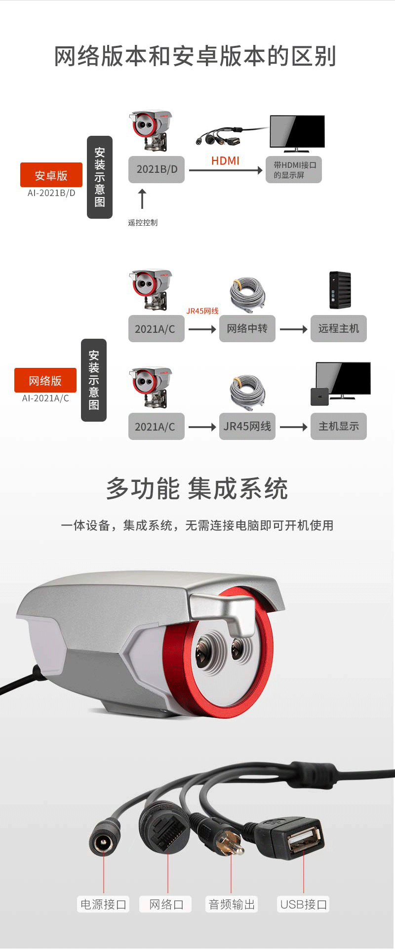 2安裝與維護 2-1,紅外熱像告警系統(tǒng)部署原則 AI-2021紅外熱像告警系統(tǒng)屬于精密測溫和成像設備,對部署應用有一定要求,注意事項如下: ·安裝環(huán)境:設備機頭所處位置需光線良好(照明度≥10OLux),應避免處于逆光的位置;設備機頭布置位置附近3米范圍內不應有空調出風口;設備機頭所監(jiān)控的視場內,不能受到光照、西曬等外界強熱源的干擾; ·機頭布置:合理布置AI-2021機頭的位置,向下俯視角度為13°~15°;合理布局人員檢測位置和范圍,Al-2021機頭的攝像頭距離被測人員的額頭的位置為1.0~5.0米,最佳測試位置為2.0米; ·被測人員要求:戶外陽光照射后,或者劇烈運動后,需在室內環(huán)境平靜適應5分鐘后進行測試;人員從戶外場景進入室內,建議經過回廊緩沖至少10秒鐘后,再步入檢測位置,如果室內外溫差較大時,建議在室內停留2~3min再行檢測;確保待測人員整個面部處于設備攝像視野內,同時面部及額頭不能被遮擋(帽子、圍巾、墨鏡、面具、退燒貼等可能遮擋面部的物件,建議先提前摘下,適應0.5-1分鐘后再進行測試。)