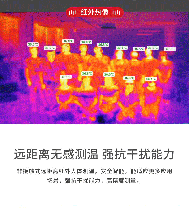熱成像篩查原理1.紅外輻射原理 自然界中一切溫度高于絕對零度(負273.15攝氏度)的物體都會輻射紅外能量,熱成像儀只是被動接受人體輻射出來的紅外能量,對人體和環(huán)境是沒有任何危害的。 2.紅外熱成像儀原理 紅外熱像儀將紅外熱輻射轉換成電信號,經過系統(tǒng)電路的處理,在顯示器上通過肉眼可見的RGB顏色顯示出來,實質上是將不可見的紅外輻射轉換為可見的熱圖像,并配以溫度顯示。 3.熱成像篩查的優(yōu)勢與注意事項 熱成像可以對其視場角范圍內的多目標同時進行體溫測量,減少人員接觸,安全效率高,但它的精度受到外界環(huán)境影響,所以應用時應該保持環(huán)境穩(wěn)定。 4.人體溫度篩查原理 篩查系統(tǒng)首先通過人臉檢測技術,獲取人臉的區(qū)域。然后通過熱成像獲取人臉區(qū)域額頭溫度。這樣可以將人臉和溫度關聯(lián)起來。 需要注意的是: 1)人的體內溫度通常在35°℃~37°C范圍內波動,受到環(huán)境,運動狀態(tài)等影響會出現(xiàn)體溫的波動,需要被測人員處于穩(wěn)定的環(huán)境中,避免劇烈運動。 2)由于是采集人臉額頭,所以被測人員不要遮擋額頭,戴口罩不影響測量。