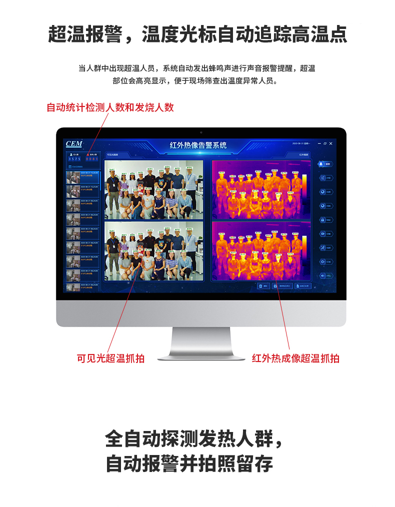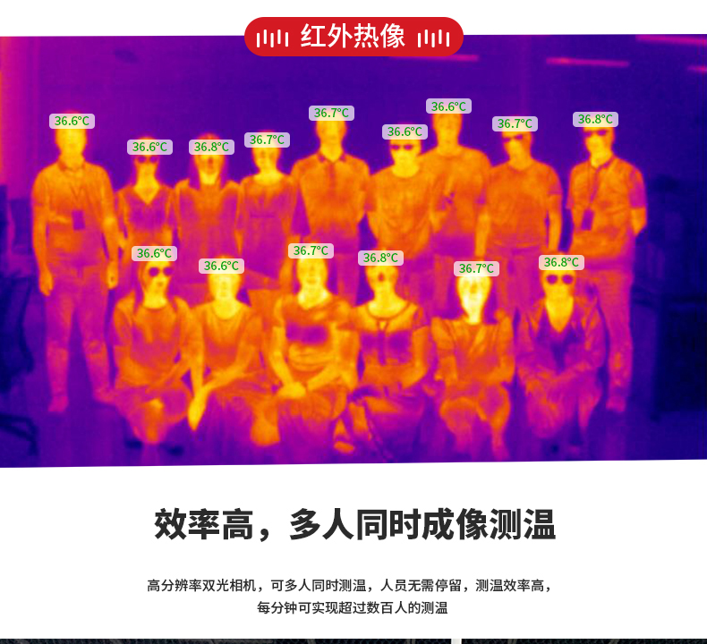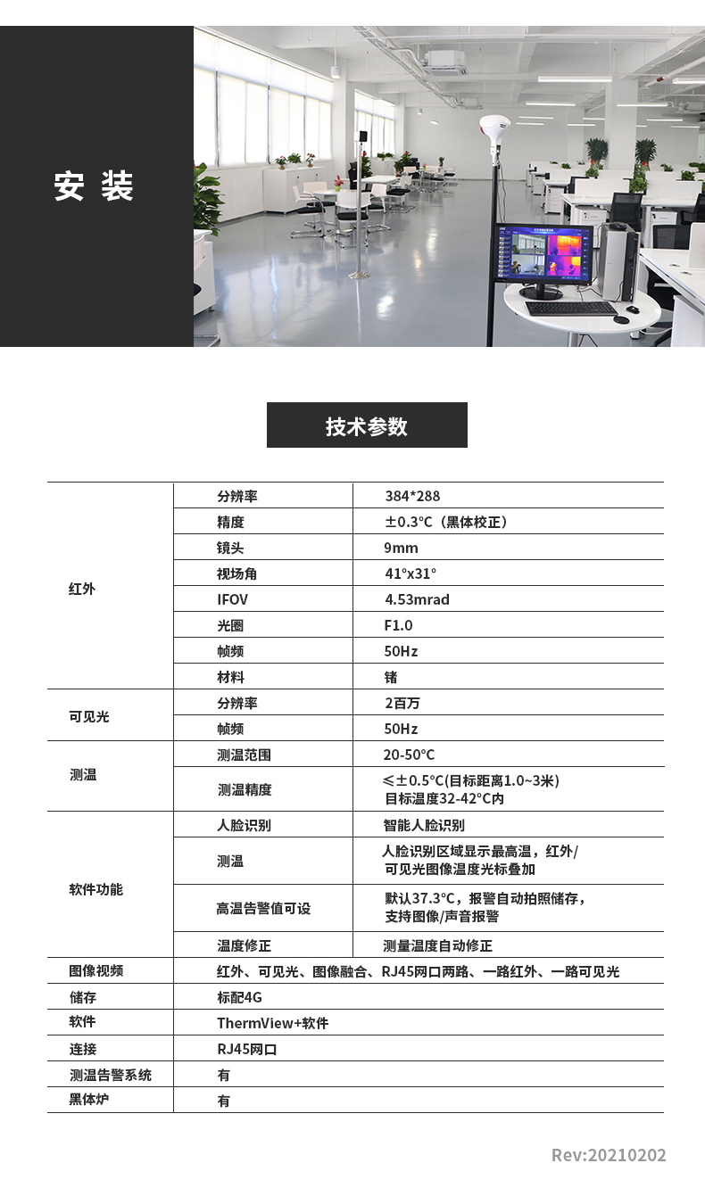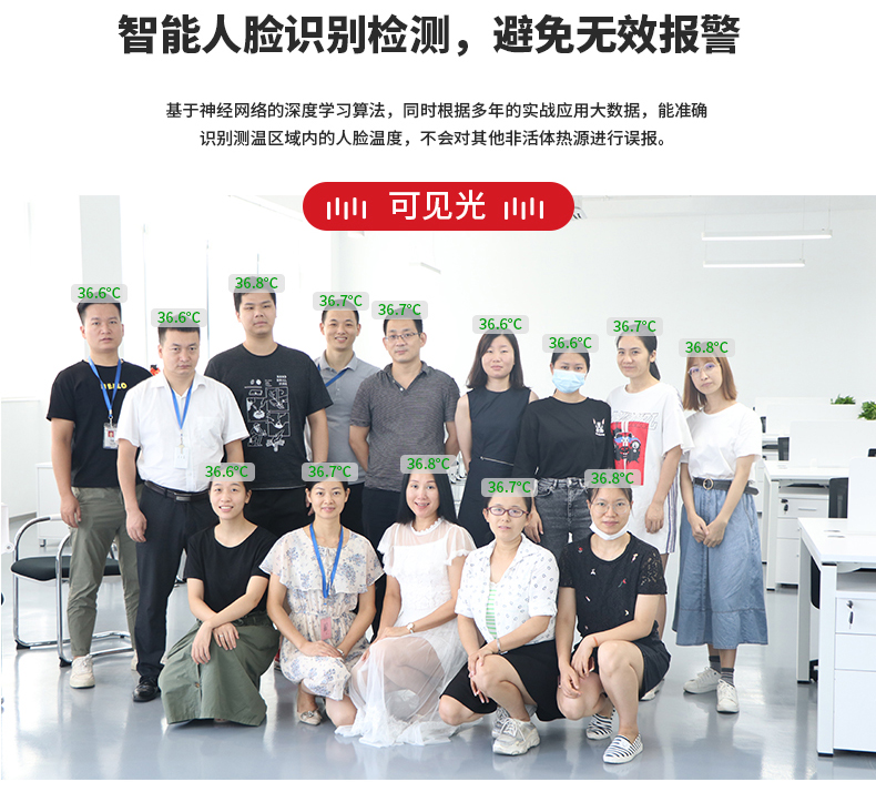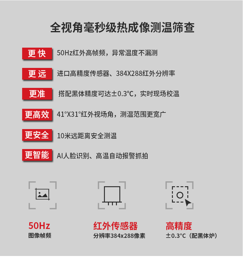 ·標配黑體,實時溫度校正,測溫精度士0.3°℃·智能快速識別測溫,效率可達900人/分鐘·AI人臉識別,排除異常熱源干擾,誤報率更低20年非接觸紅外測溫研發(fā)經(jīng)驗,測溫更優(yōu)更準確