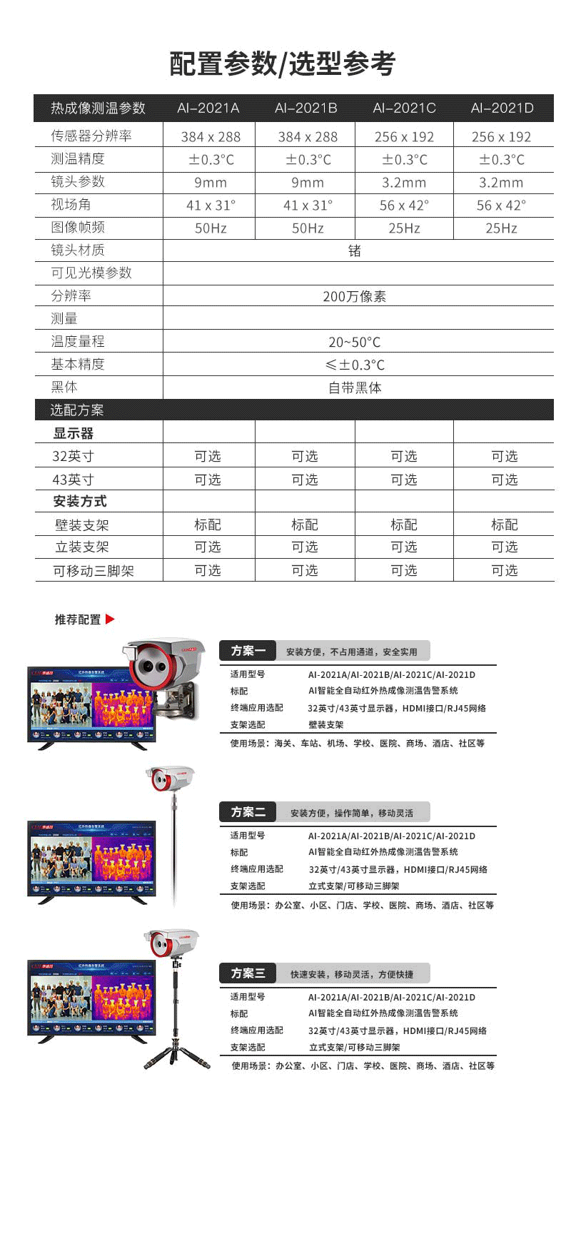 2安裝與維護(hù) 2-1,紅外熱像告警系統(tǒng)部署原則 Al-2021紅外熱像告警系統(tǒng)屬于精密測(cè)溫和成像設(shè)備,對(duì)部署應(yīng)用有一定要求,注意事項(xiàng)如下: ·安裝環(huán)境:設(shè)備機(jī)頭所處位置需光線良好(照明度≥10OLux),應(yīng)避免處于逆光的位置;設(shè)備機(jī)頭布置位置附近3米范圍內(nèi)不應(yīng)有空調(diào)出風(fēng)口;設(shè)備機(jī)頭所監(jiān)控的視場(chǎng)內(nèi),不能受到光照、西曬等外界強(qiáng)熱源的干擾; ·機(jī)頭布置:合理布置A-2021機(jī)頭的位置,向下俯視角度為13°~15°;合理布局人員檢測(cè)位置和范圍,AI-2021機(jī)頭的攝像頭距離被測(cè)人員的額頭的位置為1.0~5.0米,最佳測(cè)試位置為2.0米;