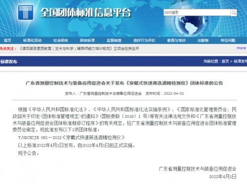 近日,由我們總公司深圳市華盛昌科技實業(yè)股份有限公司牽頭起草的《穿戴式快速篩選酒精檢測儀》團體標準審定會已經(jīng)過廣東省測量控制技術(shù)與裝備應用促進會的審查,《穿戴式快速篩選酒精檢測儀》團體標準于2022年4月1日在全國團體標準信息平臺正式發(fā)布并實施。