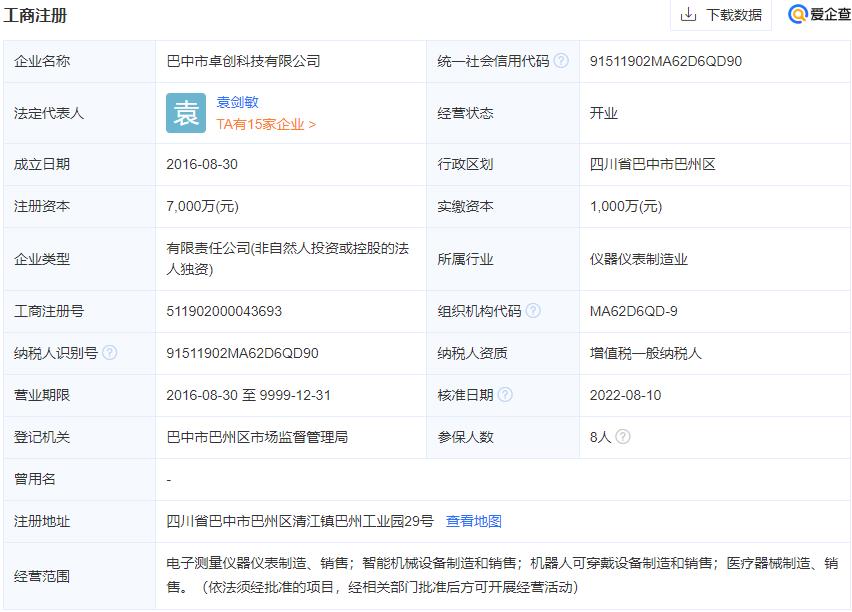 現(xiàn)巴中市卓創(chuàng)科技有限公司注冊資本:7,000萬(元) 經營范圍:電子測量儀器儀表制造、銷售;智能機械設備制造和銷售;機器人可穿戴設備制造和銷售;醫(yī)療器械制造、銷售。