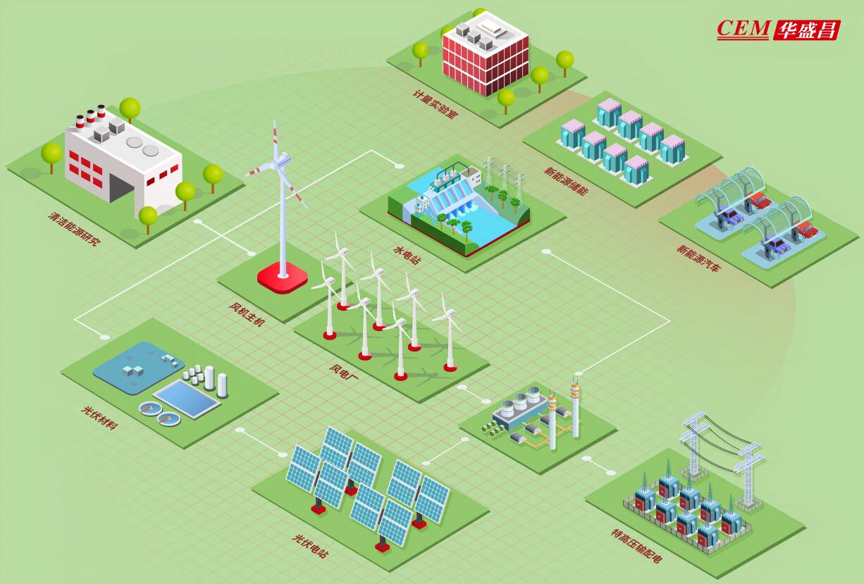 CEM華盛昌聚焦新能源行業(yè),為新能源上游精密核心材料制備以及中下游產品檢驗檢測過程,提供精湛的工藝控制技術,保障光伏電站、風電場、水電設備正常運行和安全生產。