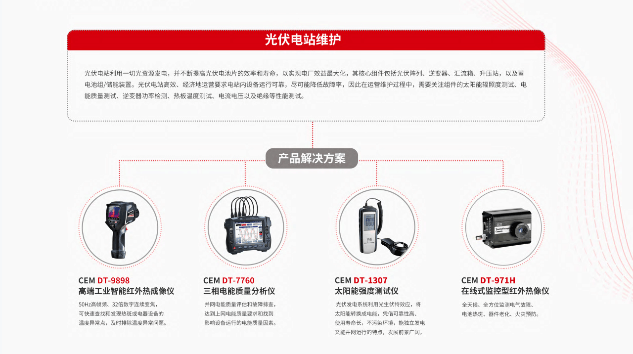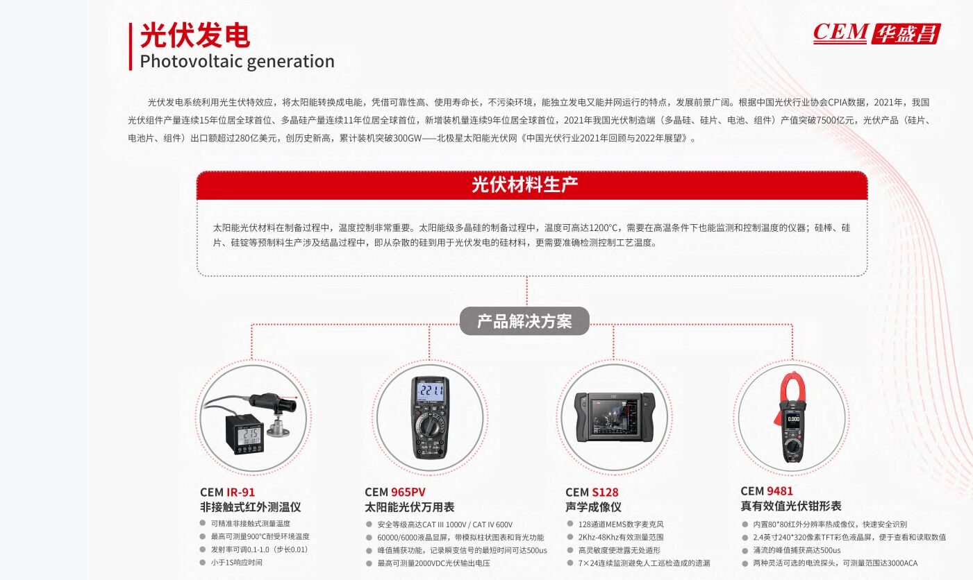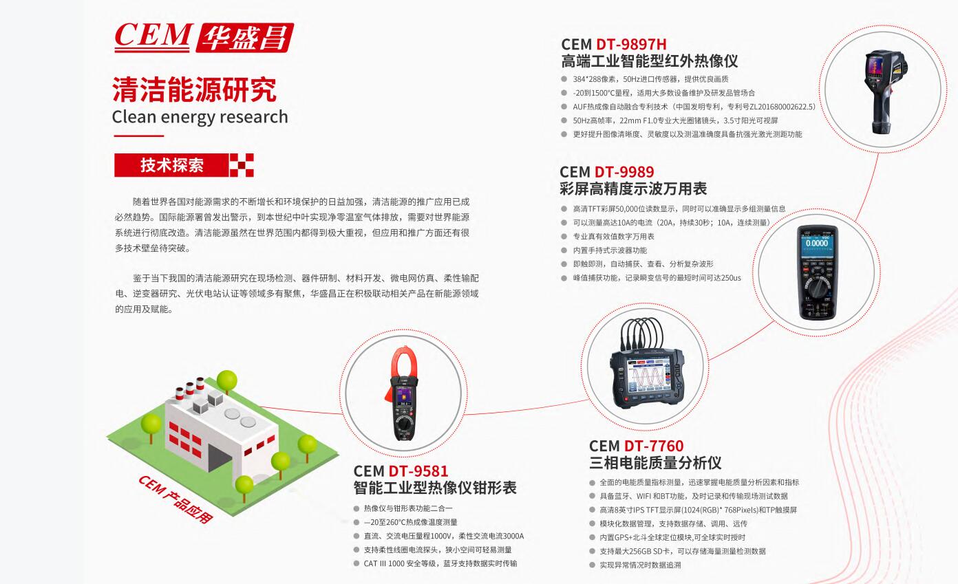鑒于當下我國的清潔能源研究在現(xiàn)場檢測、器件研制、材料開發(fā)、微電網(wǎng)仿真、柔性輸配電、逆變器研究、光伏電站認證等領域多有聚焦,華盛昌正在積極聯(lián)動相關產品在新能源領域的應用及賦能。