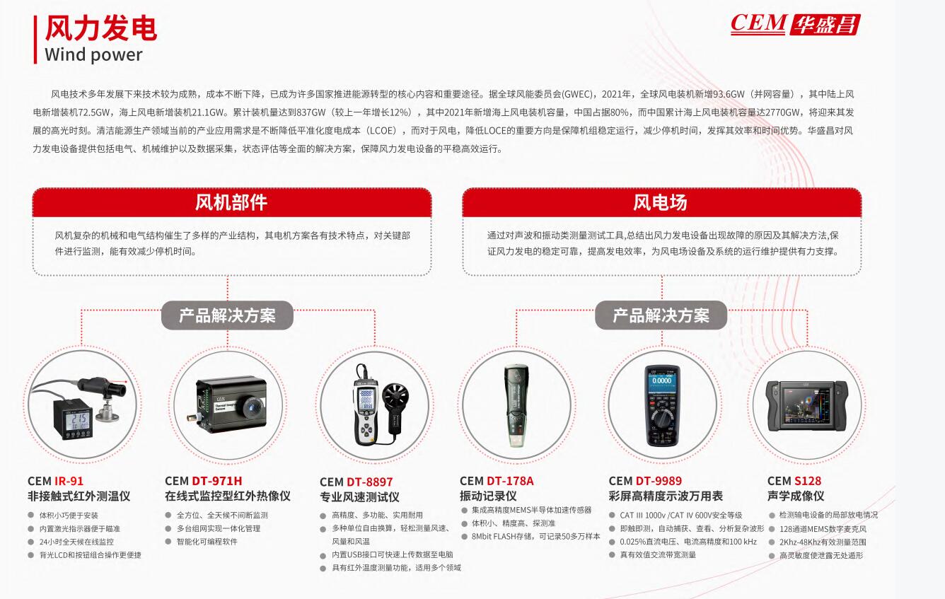 電新增接機7.6W,海上風電斯新增裝機211G6W。累計裝機量達到3375W(較上一年增長12%),其中201年新增海上風電較機容量,中國占據(jù)80%,而中國累計海上風電裝機容最達7OCSW,將迎來其發(fā)展的高光時刻。浦潔能源生產領域當前的產業(yè)應用需求是不斷降低平淮化度電成本(LCOE),而對于風電,降低LOC的重要方向是保嘀機組穩(wěn)定運行,減少停機時間,發(fā)揮其效率和時間優(yōu)勢。華盛昌對風力發(fā)電設備提供包括電氣、機械維護以及數(shù)據(jù)采集,狀態(tài)評估等全面的解決方案,保障風力發(fā)電設備的平穩(wěn)高效運行。